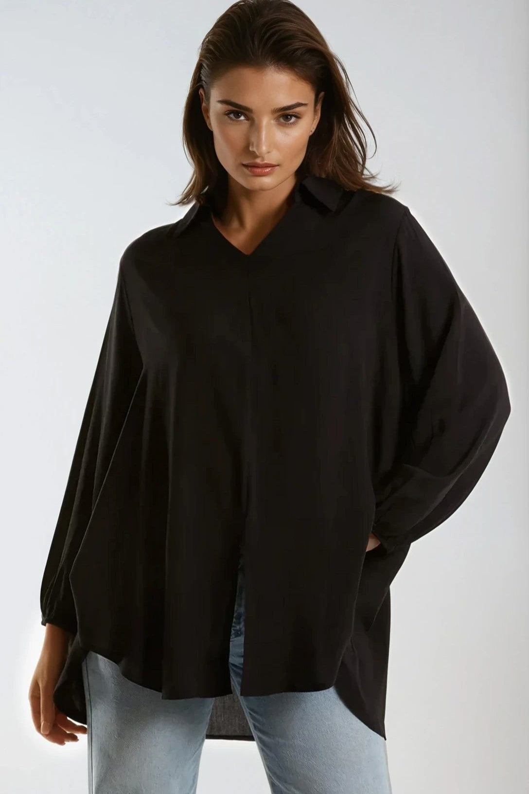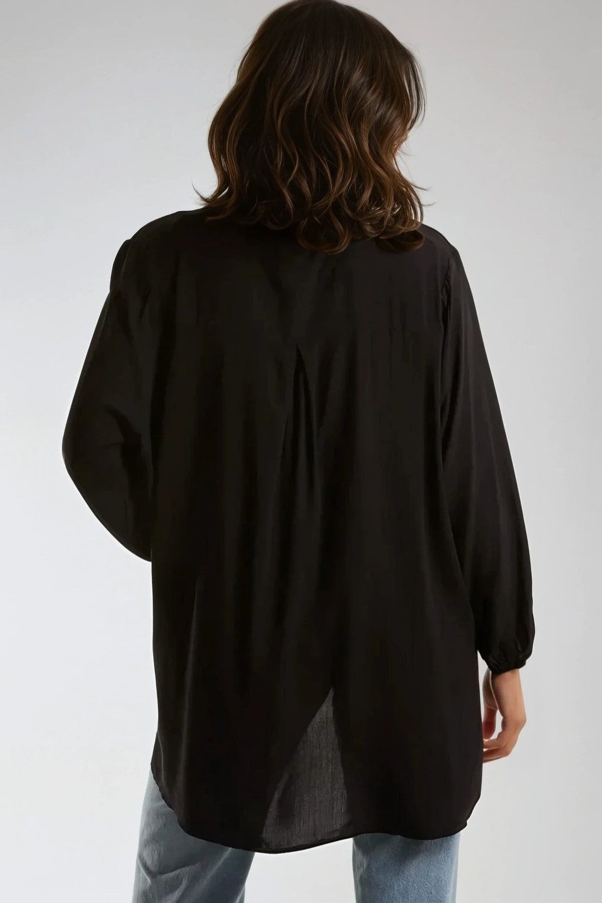 The Aftershock London Open Collar Blouse in Black is a perfect blend of style and comfort. With its longer back design and elasticated long sleeves, it offers a flattering silhouette for any occasion. The soft viscose fabric ensures you stay comfortable while looking chic, making it an ideal choice for both day and night outings.