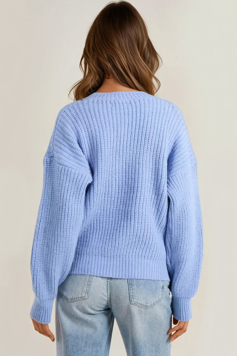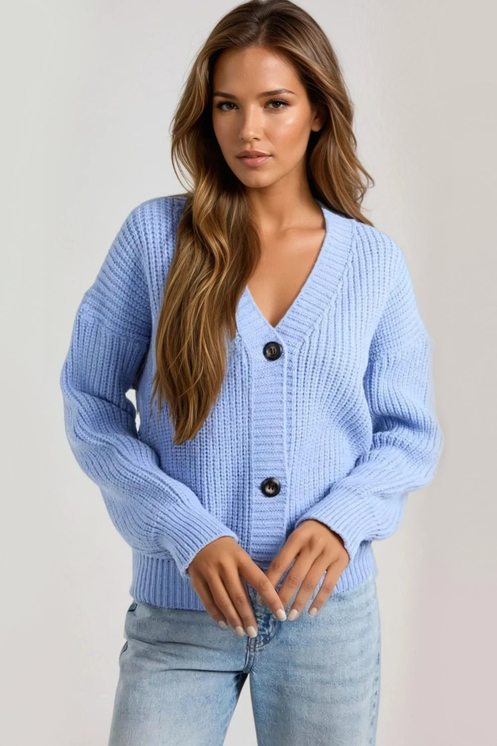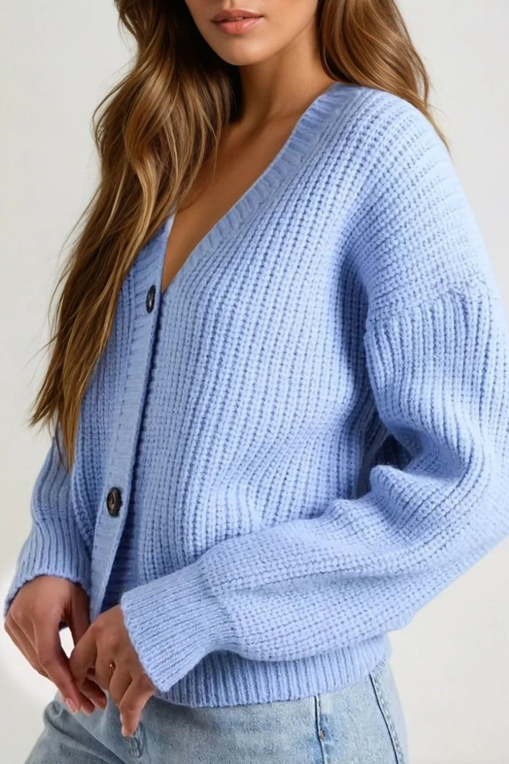The Aftershock London V-Neck Knit Cardigan in a soft light blue hue is perfect for layering this season! Featuring a stylish V-neckline and functional front buttons, it effortlessly combines elegance with comfort. The long sleeves are complemented by ribbed cuffs, adding a touch of sophistication to your look.