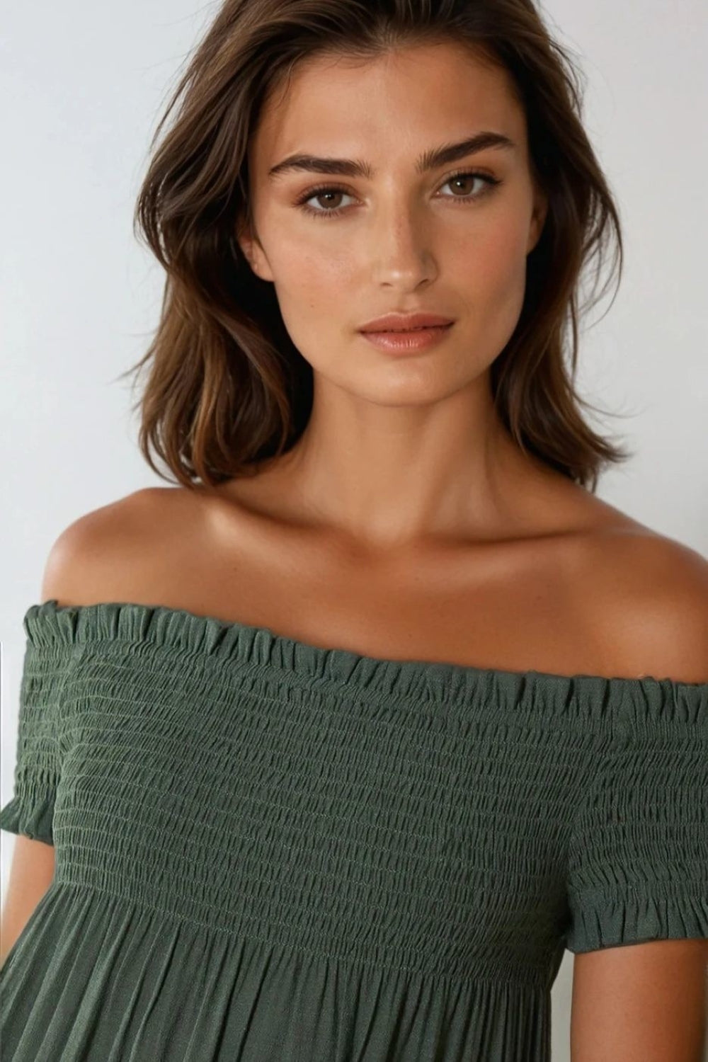 Introducing the Aftershock London Bardot Shirred Mini Dress in a stunning khaki hue! This exquisite piece effortlessly combines elegance and comfort, making it a perfect addition to your wardrobe. The floaty viscose blend fabric drapes beautifully, offering both style and ease of movement. The flattering shirred design accentuates your figure while keeping you cool and chic all day long. Get ready to turn heads and make a memorable impression wherever you go!