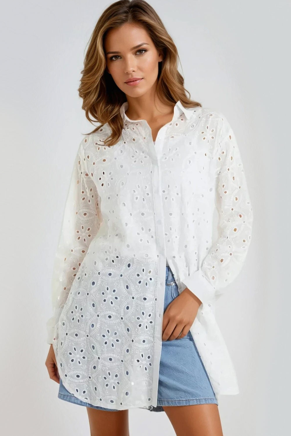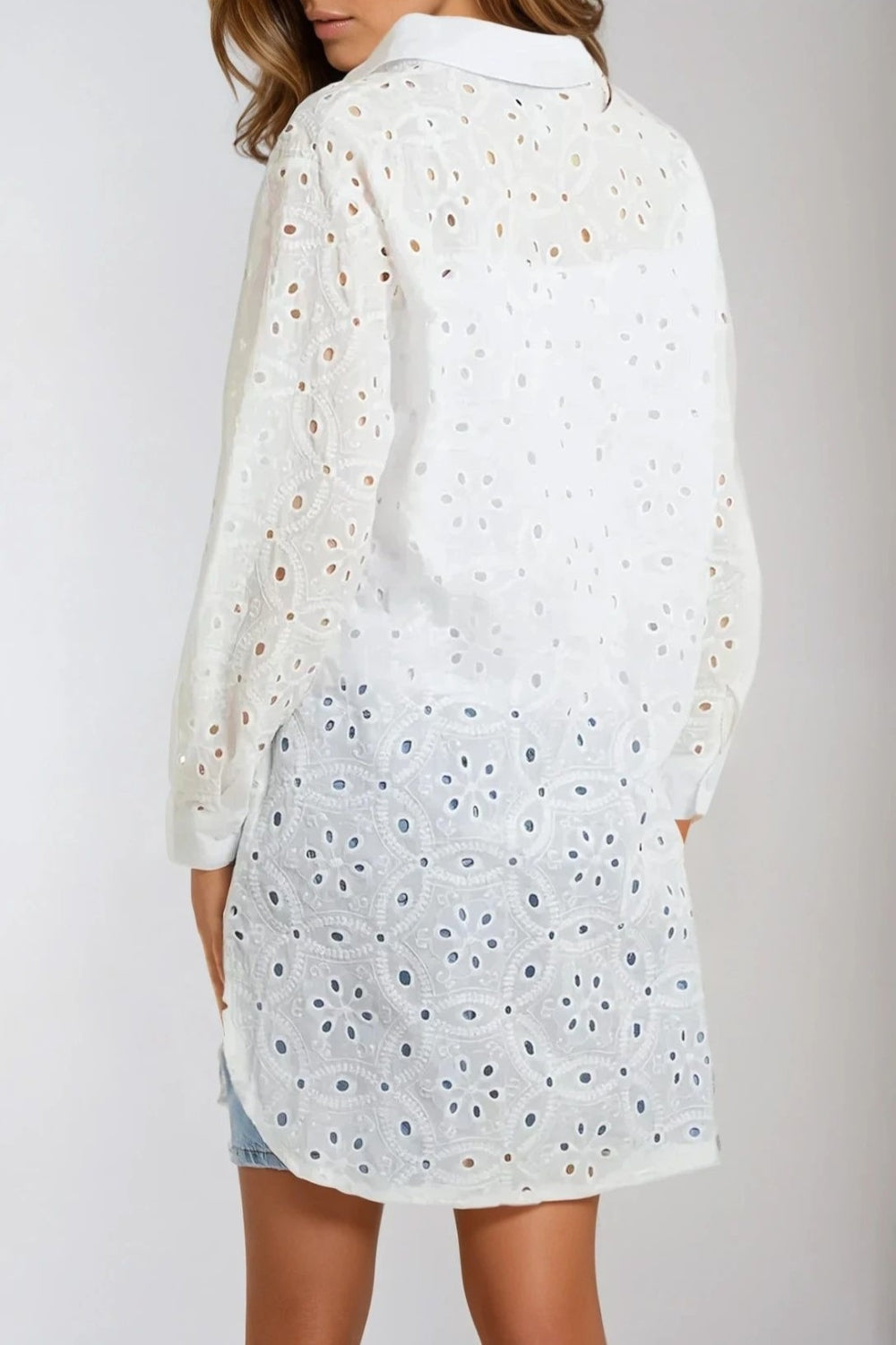 Discover elegance with The Aftershock London Broderie Anglaise Shirt in White. Its stunning broderie design adds a touch of sophistication, while the longline cut and long sleeves ensure a flattering silhouette. Perfect for any occasion, this shirt embodies timeless style and modern charm.